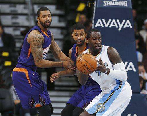 Denver Nuggets forward J.J. Hickson, right, pulls in a loose ball in front of Phoenix Suns forwards Markieff Morris, left, and Marcus Morris during the first quarter of an NBA basketball game Wednesday, Feb. 25, 2015, in Denver. (AP Photo/David Zalubowski) The Associated Press