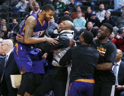 Phoenix Suns forward Marcus Morris, left, is congratulated by guard P.J. Tucker, second from left, and the rest of the Suns after Morris made a shot from half-court against the Denver Nuggets at the end of the first quarter of an NBA basketball game Wednesday, Feb. 25, 2015, in Denver. (AP Photo/David Zalubowski) The Associated Press