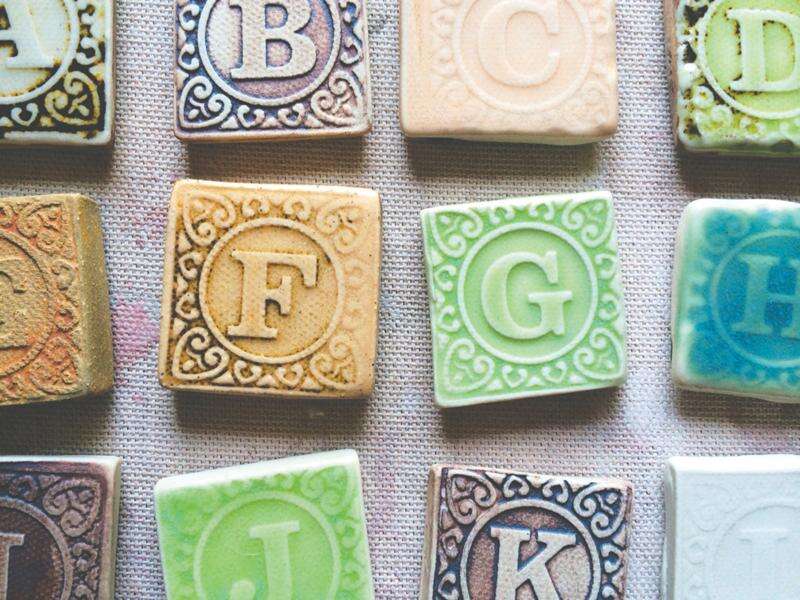 Ceramic magnets with baby block letter imprints by Heather Lezla. Courtesy of Heather Lezla