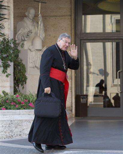 FILE - In this Oct. 6, 2014 file photo Cardinal George Pell waves to photographers as he arrives for a morning session of a synod on family issues, at the Vatican. Pope Francis' finance czar is coming under intense scrutiny after ruffling feathers at the Vatican as he seeks to impose order on its unruly finances. Italian weekly L'Espresso reported in its Friday, Feb. 27, 2015 editions that Cardinal George Pell's economy secretariat had run up a half-million euros (dollars) in expenses in the first six months of its existence. The total includes seemingly legitimate expenses, including computers and printers, but also a 2,508 euro bill from the famed Gamarelli clergy tailor. The expenditures are notable given that Pell has instituted a spending review across the Vatican to ensure any excess money is spent on the poor, L'Espresso noted. (AP Photo/Alessandra Tarantino, File) The Associated Press