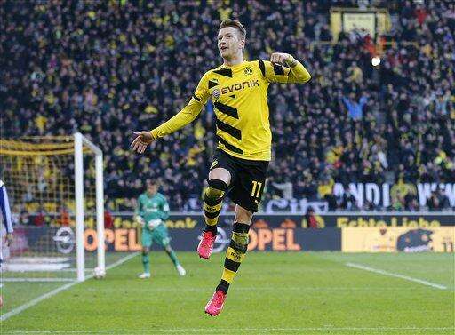 Dortmund's Marco Reus celebrates after scoring during the German first division Bundesliga soccer match between BvB Borussia Dortmund and Schalke 04 in Dortmund, Germany, Saturday, Feb. 28, 2015. (AP Photo/Frank Augstein) The Associated Press