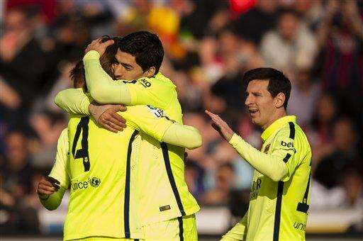 Barcelona's Luis Suarez, center, celebrates his goal with teammates Ivan Rakitic, left, and Lionel Messi during a Spanish La Liga soccer match between Granada and FC Barcelona at Los Carmenes stadium in Granada, Spain, Saturday Feb. 28, 2015. (AP Photo/Daniel Tejedor) The Associated Press