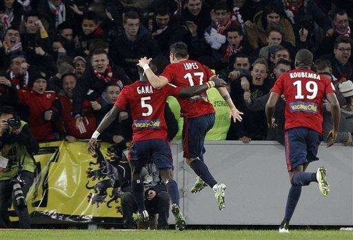 Lille players react after scoring during their French League one soccer match against Lyon at the Lille Metropole stadium, in Villeneuve d'Ascq, northern France, Saturday, Feb. 28, 2015. (AP Photo/Michel Spingler) The Associated Press