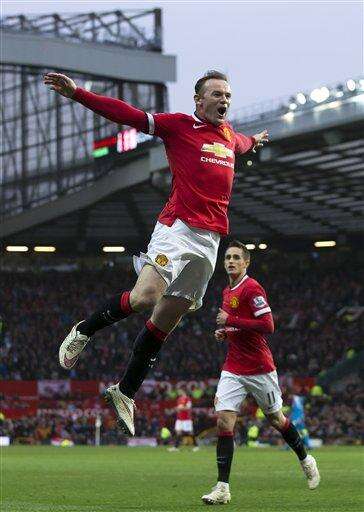 Manchester United's Wayne Rooney, center, celebrates after scoring his second goal during the English Premier League soccer match between Manchester United and Sunderland at Old Trafford Stadium, Manchester, England, Saturday Feb. 28, 2015. (AP Photo/Jon Super) The Associated Press