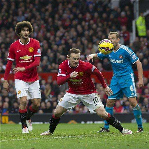 Manchester United's Wayne Rooney, centre, scores his second goal during the English Premier League soccer match between Manchester United and Sunderland at Old Trafford Stadium, Manchester, England, Saturday Feb. 28, 2015. (AP Photo/Jon Super) The Associated Press