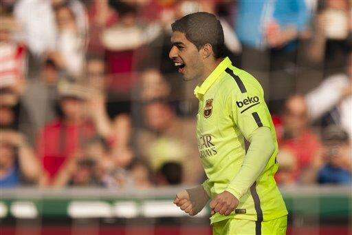 Barcelona's Luis Suarez celebrates his goal during a Spanish La Liga soccer match between Granada and FC Barcelona at Los Carmenes stadium in Granada, Spain, Saturday Feb. 28, 2015. (AP Photo/Daniel Tejedor) The Associated Press