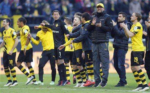 Dortmund players and coach celebrate after the German first division Bundesliga soccer match between BvB Borussia Dortmund and Schalke 04 in Dortmund, Germany, Saturday, Feb. 28, 2015. Dortmund won by 3-0.(AP Photo/Frank Augstein) The Associated Press