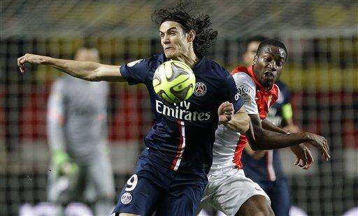 PSG's Edinson Cavani, left, challenges for the ball with Monaco's Geoffrey Kondogbia during the French League One soccer match between Monaco and Paris Saint Germain, in Monaco stadium, Sunday, March 1, 2015. (AP Photo/Lionel Cironneau) The Associated Press