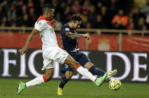 Monaco's Fortuna Dos Santos Wallace, left, challenges for the ball with PSG's Ezequiel Lavezzi, during the French League One soccer match between Monaco and Paris Saint Germain, in Monaco stadium, Sunday, March 1, 2015. (AP Photo/Lionel Cironneau) The Associated Press