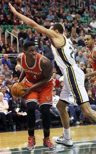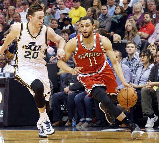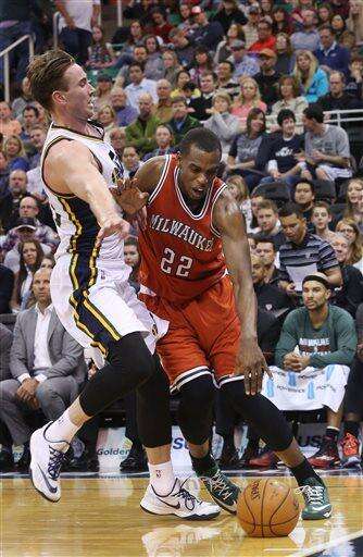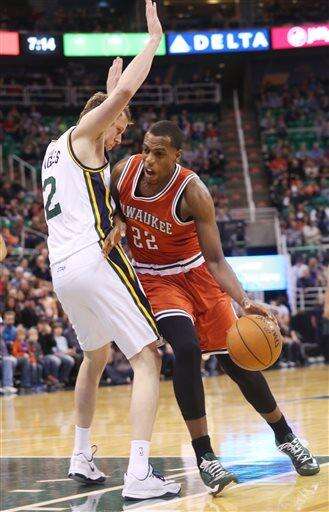 Milwaukee Bucks' Khris Middleton (22) drives the basket as Utah Jazz's Joe Ingles (2) defends in the first half of an NBA basketball game on Saturday, Feb. 28, 2015, in Salt Lake City. (AP Photo/Kim Raff) The Associated Press
