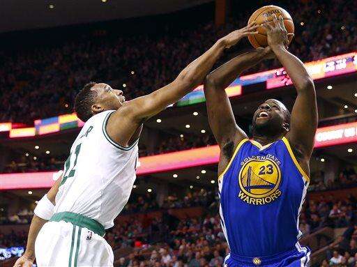 Golden State Warriors' Draymond Green (23) has his shot blocked by Boston Celtics' Evan Turner during the first quarter of an NBA basketball game in Boston, Sunday, March 1, 2015. (AP Photo/Winslow Townson)