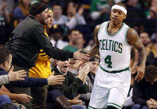 Boston Celtics' Isaiah Thomas (4) is congratulated by fans after making a basket against the Golden State Warriors during the second quarter of an NBA basketball game in Boston, Sunday, March 1, 2015. (AP Photo/Winslow Townson)