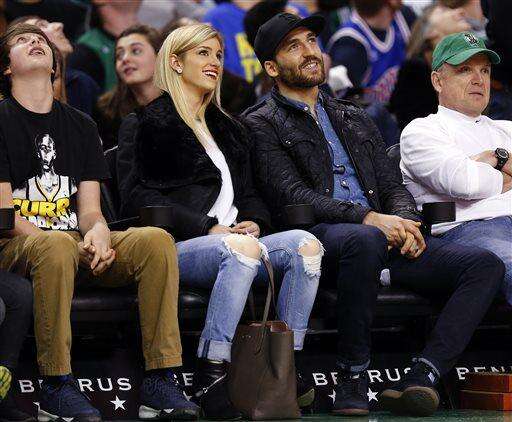 Boston Bruins' Patrice Bergeron, second from right, and his wife Stephanie look on from courtside during the second quarter of an NBA basketball game between the Boston Celtics and the Golden State Warriors in Boston, Sunday, March 1, 2015. (AP Photo/Winslow Townson)