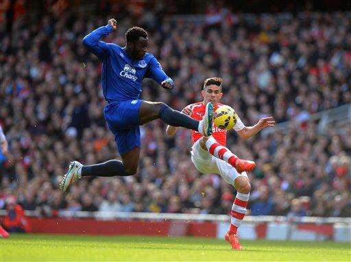 Arsenal's Gabriel, right, is tackled by Everton's Romelu Lukaku during their English Premier League soccer match at the Emirates Stadium, London, Sunday, March 1, 2015. (AP Photo/Tony Marshall, PA Wire) UNITED KINGDOM OUT - NO SALES - NO ARCHIVES The Associated Press