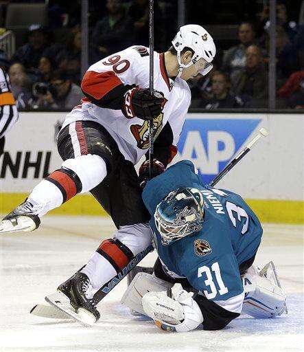 Ottawa Senators' Alex Chiasson, left, collides with San Jose Sharks goalie Antti Niemi (31) during the second period of an NHL hockey game Saturday, Feb. 28, 2015, in San Jose, Calif. (AP Photo/Ben Margot) The Associated Press