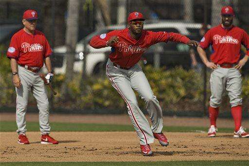 Philadelphia Phillies outfielder Domonic Brown, center, takes a lead off first base during the team's first full-squad workout Tuesday, Feb 24, 2015, at the Phillies spring training baseball facility in Clearwater, Fla. (AP Photo/Steve Nesius)