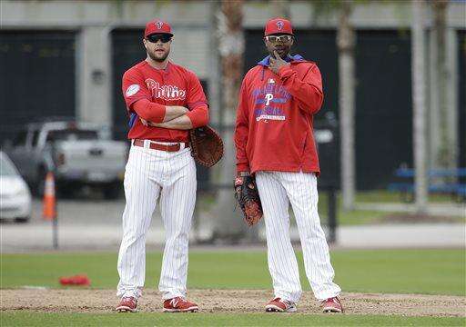 Philadelphia Phillies' Darin Ruf, left, stands with first baseman Ryan Howard, right, during a spring training baseball workout, Friday, Feb. 27, 2015, in Clearwater, Fla. (AP Photo/Lynne Sladky)