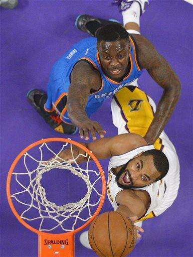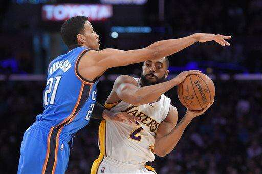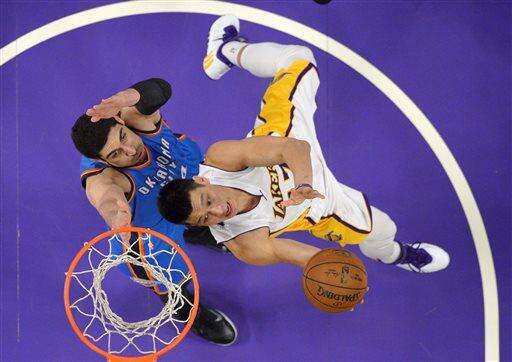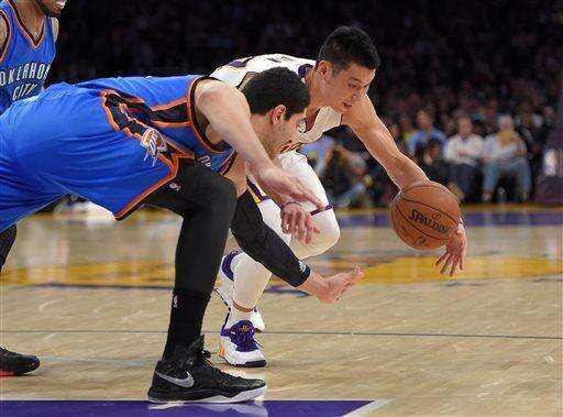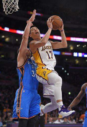 Lakers: Lin is averaging 17.0 points per game since the All-Star break. ... Rookie point guard Jordan Clarkson had 12 points and four assists. He was a San Antonio high school teammate of Roberson, who scored eight points for the Thunder. ... The teams meet again in Oklahoma City on March 24.