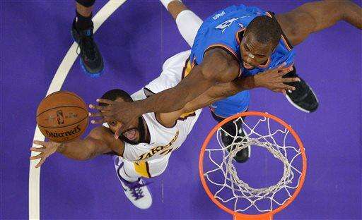 The game looked like trouble on paper for the eighth-place Thunder. Durant is out with a foot injury, while Westbrook underwent surgery on his right cheek Saturday in his native Los Angeles, where the Lakers had won a season-best three straight.