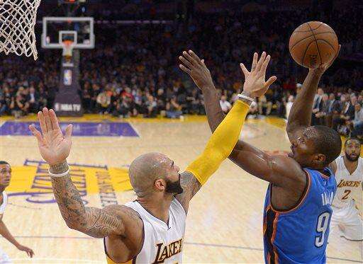 Oklahoma City grabbed 16 offensive rebounds to Los Angeles' nine. The disparity was the primary reason that Lakers coach Byron Scott thought all of his big men were soundly outplayed. Ibaka had five of those offensive boards. "It was offensive rebounds that cost us the game," Lakers forward Ed Davis said. "I don't know exactly what the second-chance points were (20-13 for the Thunder), but they definitely killed us on the glass, and that's probably the main reason why we lost."