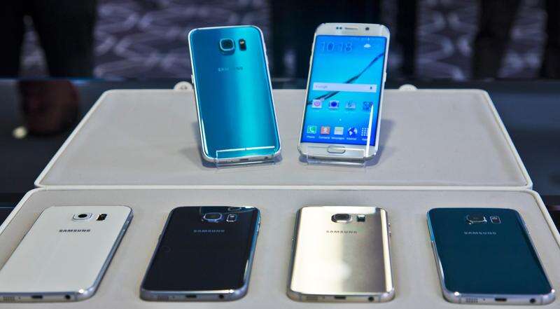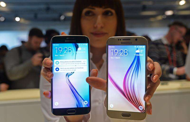 The new Galaxy S6, right, and S6 Edge are displayed during a Samsung Galaxy Unpacked 2015 event on the eve of this week's Mobile World Congress wireless show in Barcelona, Spain, Sunday. Associated Press