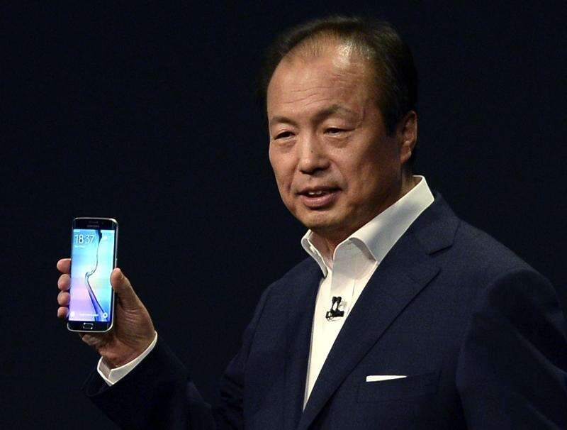 JK Shin, CEO of Samsung's mobile division, shows the new Galaxy S6 during the Samsung Galaxy Unpacked 2015 event on the eve of this week's Mobile World Congress wireless show, in Barcelona, Spain, Sunday. Associated Press