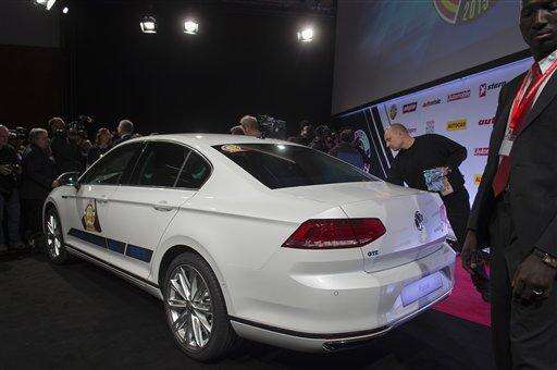 The New Volkswagen Passat, the car of the Year 2015, is on display during the award ceremony ahead of the Geneva Motor Show in Geneva, Switzerland, Monday, March 2, 2015. The large family car Volkswagen Passat has been voted car of the year by European automotive editors at the Geneva International Motor Show. German Volkswagen's four-door sedan beat six other finalists including Citroen's C4 Cactus, Renault's Twingo and the BMW 2-Series Active Tourer. The Passat has an updated collision avoidance system compared to its predecessor and other new technology, including emergency driver assistance and cross-wind stabilization. (AP Photo/Keystone,Sandro Campardo)