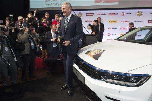 Heinz-Jakob Neusser, Head of Powertrain Development, Volkswagen AG, with a New Volkswagen Passat, the car of the Year 2015, during the award ceremony ahead of the Geneva Motor Show in Geneva, Switzerland, Monday, March 2, 2015. The large family car Volkswagen Passat has been voted car of the year by European automotive editors at the Geneva International Motor Show. German Volkswagen's four-door sedan beat six other finalists including Citroen's C4 Cactus, Renault's Twingo and the BMW 2-Series Active Tourer. The Passat has an updated collision avoidance system compared to its predecessor and other new technology, including emergency driver assistance and cross-wind stabilization. (AP Photo/Keystone,Sandro Campardo)