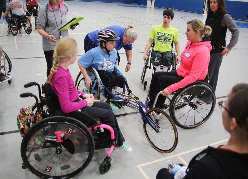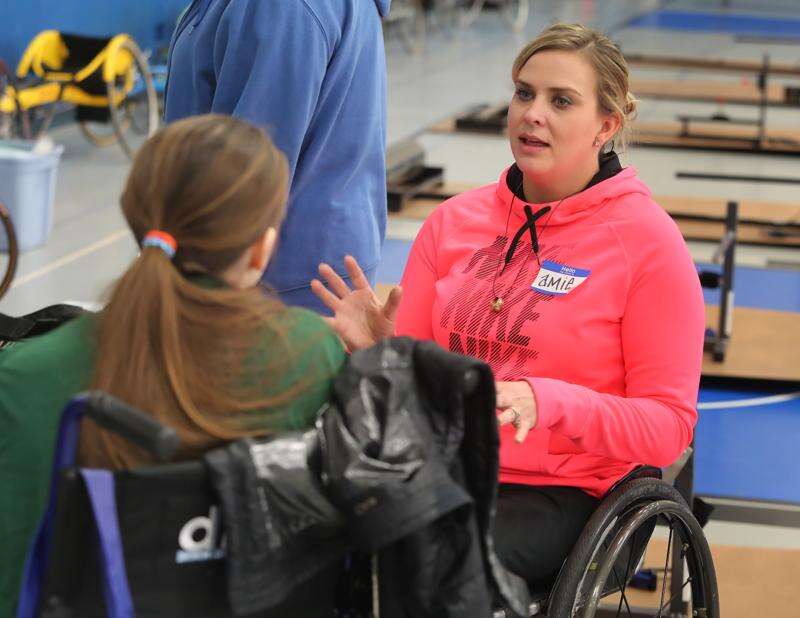 U.S. Paralympian Amie Stanton Day, right, talks with Amanda Becker, 10 of Kenosha, Wisconsin, after she was fitted for a racing wheelchair during a clinic Sunday hosted by the Great Lakes Adaptive Sports Association at Vernon Hills High School. Fellow Paralympian Amanda McGrory joined Stanton Day in leading the event.