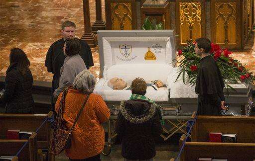 Members of the community pay their respects to Rev. Theodore Hesburgh during visitation on Tuesday, March 3, 2015, inside the Sacred Heart Basilica at the University of Notre Dame in South Bend, Ind. Thousands of students, alumni and admirers are expected on the University of Notre Dame campus Tuesday to pay their respects to the Rev. Theodore Hesburgh, who served as the school's president for 35 years while also promoting human rights. Hesburgh died Thursday, Feb. 26, 2015. He was at 97. (AP Photo/South Bend Tribune, Robert Franklin, Pool)