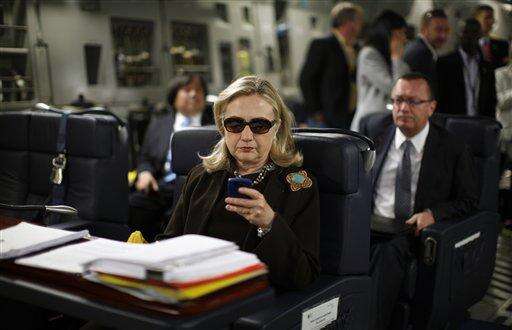 FILE - In this Oct. 18, 2011, file photo, then-Secretary of State Hillary Rodham Clinton checks her Blackberry from a desk inside a C-17 military plane upon her departure from Malta, in the Mediterranean Sea, bound for Tripoli, Libya. Clinton used a personal email account during her time as secretary of state, rather than a government-issued email address, potentially hampering efforts to archive official government documents required by law. Clinton's office said nothing was illegal or improper about her use of the non-government account and that she believed her business emails to State Department and other .gov accounts would be archived in accordance with government rules. (AP Photo/Kevin Lamarque, Pool, File) The Associated Press