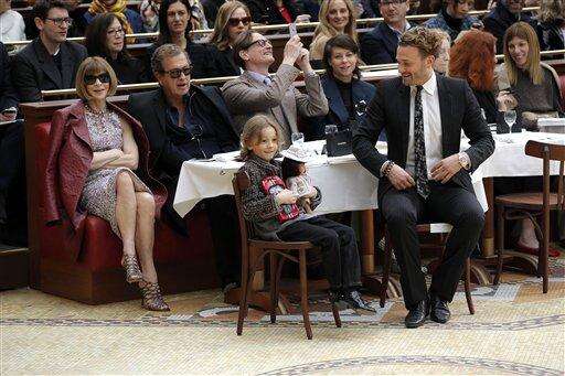 US Vogue chief editor Anna Wintour, left, Peruvian fashion photographer Mario Testino, second left, Hudson Kroenig, son of US model Brad Kroening and model Brad Kroening attend with other guests Chanel's ready to wear fall-winter 2015-2016 fashion collection during Paris fashion week, Paris, France, Tuesday, March 10, 2015. (AP Photo/Francois Mori)