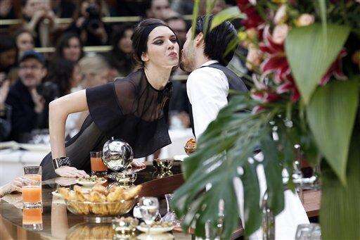 CORRECT'S NAME OF MODEL Model Kendall Jenner kisses a waiter as she wears creations for Chanel's ready to wear fall-winter 2015-2016 fashion collection during Paris fashion week, Paris, France, Tuesday, March 10, 2015. (AP Photo/Francois Mori)