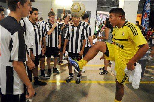 FILE- In this July 3, 2012, file photo, Jonah Valdez of Santa Clarita, Calif., shows off his skills during opening ceremonies of the American Youth Soccer Organization National Games in Knoxville, Tenn. The Fox network announced a five-year partnership Wednesday, March 11, 2015, with the American Youth Soccer Organization. "Fox Sports 1" will be added this string to the right chest of AYSO jerseys, which have had AYSO logos on the left chest for a half century. (AP Photo/Knoxville News Sentinel, Adam Brimer, File) The Associated Press