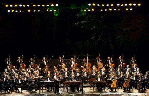 FILE - In this July 10, 2009 file photo the original Budapest Gypsy Symphony Orchestra performs during a concert on the open-air stage of Margaret Island in Budapest, Hungary. The orchestra says Wednesday, March 11, 2015, a temporary injunction has banned the producer of another large group of Gypsy musicians from copying their name. Nandor Farkas Beke, manager of the orchestra, said that the ruling by a court in Lyon, France, will be in place until the issue is conclusively settled in a lawsuit to be filed soon. (AP Photo/MTI, Peter Kollanyi, File)