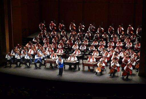 FILE - In this April 27, 2012 file photo the original Budapest Gypsy Symphony Orchestra performs during a concert in Paris, France. The orchestra says Wednesday, March 11, 2015, a temporary injunction has banned the producer of another large group of Gypsy musicians from copying their name. Nandor Farkas Beke, manager of the orchestra, said that the ruling by a court in Lyon, France, will be in place until the issue is conclusively settled in a lawsuit to be filed soon. (AP Photo/MTI, Peter E. Varkonyi, File)