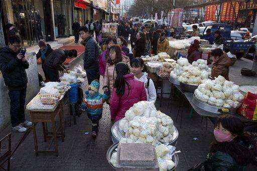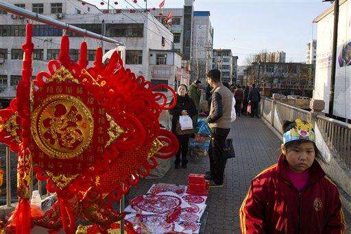 In this Feb. 5, 2015 photo, residents walk past street vendors selling Chinese New Year decorations on a street of Gujiao in northern China's Shanxi province. From coal country to the export-driven manufacturing heartland of Chinaâs southeast, millions of people are enduring wrenching change. Beijing is trying to replace an economic model that has run out of steam after delivering years of blistering growth based on trade and investment in construction and heavy industry. (AP Photo/Ng Han Guan)