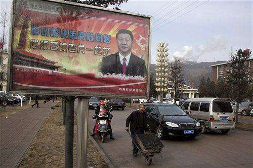 In this Feb. 6, 2015 photo, a motorcyclist uses his mobile phone near a billboard showing Chinese President Xi Jinping with the slogan "To exactly solve the problem of corruption, we must hit both flies and tigers" in Gujiao in northern China's Shanxi province. Chinese leaders have promised to generate new jobs by opening more of the state-dominated economy to private business. But they have yet to cut back monopolies and other privileges for politically favored government companies that reform advocates say are a drag on development. (AP Photo/Ng Han Guan)