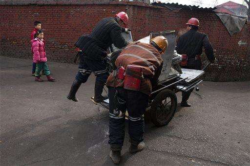 In this Feb. 6, 2015 photo, children watch as coal miners transport metal parts from a mine in Gujiao in northern China's Shanxi province. Chinaâs coal production is estimated by its main industry group to have fallen 2.5 percent last year, the first reduction in two decades. Environmentalists welcomed that as a sign coal use might decline, but it prompted unease about the health of an industry that the Ministry of Land and Resources says employs 10.3 million people. (AP Photo/Ng Han Guan)