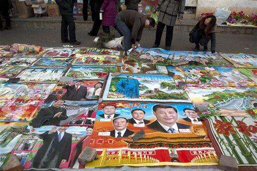 In this Feb. 5, 2015 photo, a vendor attends to customers near Chinese New Year posters featuring Chinese President Xi Jinping and late leader Mao Zedong on a street of Gujiao in northern China's Shanxi province. From coal country to the export-driven manufacturing heartland of Chinaâs southeast, millions of people are enduring wrenching change. Beijing is trying to replace an economic model that has run out of steam after delivering years of blistering growth based on trade and investment in construction and heavy industry. (AP Photo/Ng Han Guan)