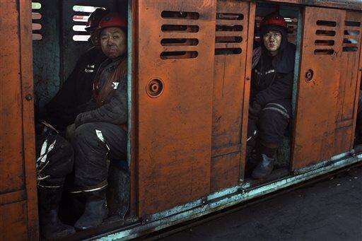 In this Feb. 6, 2015 photo, coal miners wait for their ride down the tunnel to start their eight hour shift in Gujiao in northern China's Shanxi province. Chinaâs coal production is estimated by its main industry group to have fallen 2.5 percent last year, the first reduction in two decades. Environmentalists welcomed that as a sign coal use might decline, but it prompted unease about the health of an industry that the Ministry of Land and Resources says employs 10.3 million people. (AP Photo/Ng Han Guan)