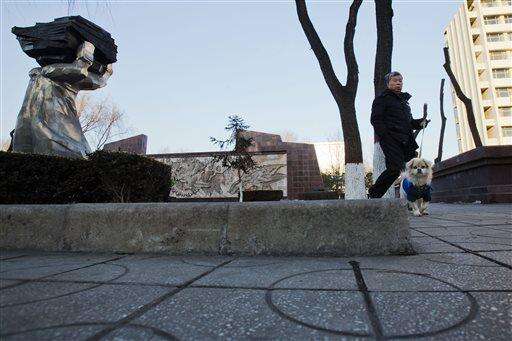 In this Feb. 6, 2015 photo, a man walks his dog near a giant sculpture depicting a hand holding a piece of coal in Gujiao in northern China's Shanxi province. Chinaâs coal production is estimated by its main industry group to have fallen 2.5 percent last year, the first reduction in two decades. Environmentalists welcomed that as a sign coal use might decline, but it prompted unease about the health of an industry that the Ministry of Land and Resources says employs 10.3 million people. (AP Photo/Ng Han Guan)