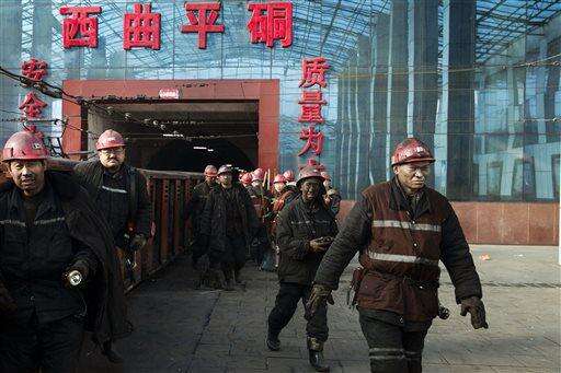 In this Feb. 6, 2015 photo, coal miners return to the surface after their eight hours shift at a coal mine in Gujiao in northern China's Shanxi province. Chinaâs coal production is estimated by its main industry group to have fallen 2.5 percent last year, the first reduction in two decades. Environmentalists welcomed that as a sign coal use might decline, but it prompted unease about the health of an industry that the Ministry of Land and Resources says employs 10.3 million people. (AP Photo/Ng Han Guan)