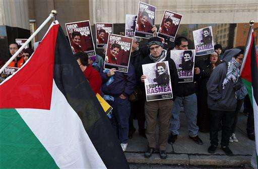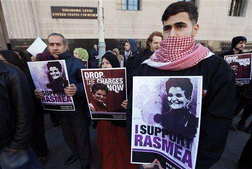 Protesters rally for Rasmea Odeh outside federal court in Detroit Thursday, March 12, 2015. Odeh, a Chicago Arab activist convicted of lying about her role in two 1969 terrorist bombing deaths in Israel when she immigrated to the U.S. faces sentencing in Detroit federal court. (AP Photo/Paul Sancya)