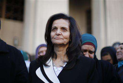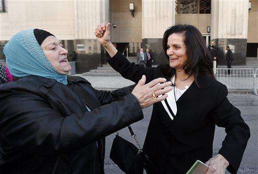 Rasmea Odeh listens to supporters after leaving federal court in Detroit Thursday, March 12, 2015. A judge sentenced the Chicago activist to 18 months in federal prison Thursday for failing to disclose her convictions for bombings in Israel when she applied to be a U.S. citizen. Odeh, 67, also was stripped of her citizenship and eventually will be deported. But she will remain free while she appeals the case. (AP Photo/Paul Sancya)