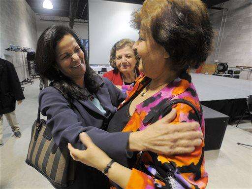 Rasmieh Odeh is greeted by Muna Salloum, right, of Ann Arbor, as Elaine Rimman, center, looks on during a fundraiser sponsored by her supporters at the Arab American Museum annex in Dearborn, Mich., on Wednesday, March 11, 2015. Odeh is returning to federal court on Thursday, four months after she was convicted of failing to disclose a criminal record in Israel. She was convicted of two bombings in Jerusalem in 1969. The 67-year-old Odeh runs daily operations at Chicago's Arab American Action Network. She faces deportation after a possible prison sentence. (AP Photo/Detroit News, Steve Perez ) DETROIT FREE PRESS OUT; HUFFINGTON POST OUT