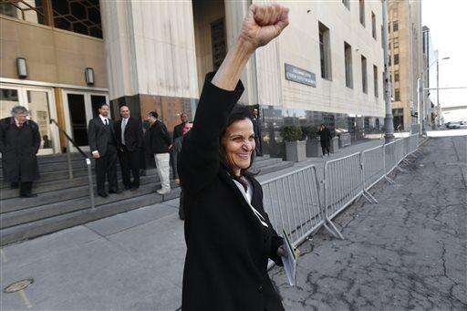 Rasmea Odeh raises her fist as she leaves federal court in Detroit Thursday, March 12, 2015. A judge sentenced the Chicago activist to 18 months in federal prison Thursday for failing to disclose her convictions for bombings in Israel when she applied to be a U.S. citizen. Odeh, 67, also was stripped of her citizenship and eventually will be deported. But she will remain free while she appeals the case. (AP Photo/Paul Sancya)