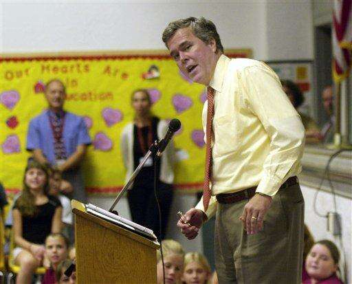 FILE - In this Sept. 4, 2003, file photo then-Florida Gov. Jeb Bush speaks with students at the Ross E. Jeffries Elementary school in St. Cloud, Fla. Among the many thousands of emails Bush received as Florida governor are a string of notes from campaign donors asking for favors and making suggestions. Invariably, Bush responded politely. Sometimes, he appointed a person a donor had recommended. Other times, he rejected their advice about a piece of legislation. It’s an insight into Bush’s work as governor that's only possible because his emails are available for review, something not yet possible for those sent and received by Hillary Rodham Clinton as secretary of state. (AP Photo/Peter Cosgrove, File) The Associated Press