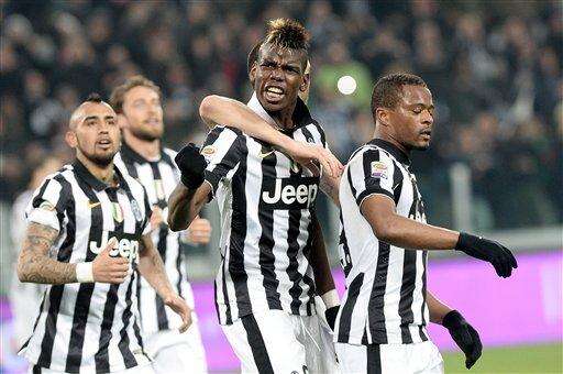 Juventus' Paul Pogba, foreground, celebrates with his teammates after scoring during a Serie A soccer match between Juventus and Sassuolo at the Juventus stadium, in Turin, Italy, Monday, March 9, 2015. Juventus won 1-0. (AP Photo/Massimo Pinca) The Associated Press