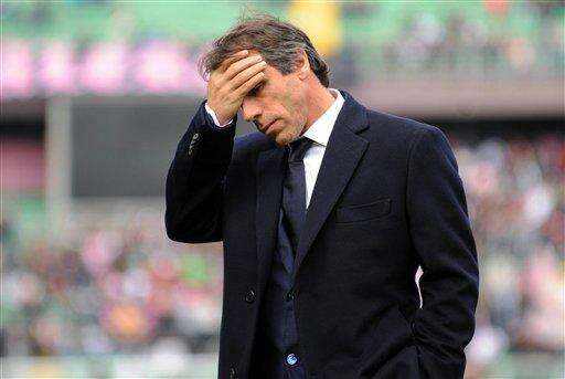 In this photo taken on Jan. 6, 2015 Cagliari coach Gianfranco Zola touches his forehead prior to a Serie A soccer match between Palermo and Cagliari in Palermo, Italy. Cagliari has fired Gianfranco Zola as coach after less than three months in charge and rehired Zdenek Zeman, with the Serie A club battling against relegation. A Cagliari statement Monday, March 9, 2015 says it is "a decision taken reluctantly regarding a great man who has written unforgettable pages in Cagliari's history, giving eminence and international prestige to Sardinia." The 48-year-old Zola, who ended his playing career at Cagliari in 2005, replaced the 67-year-old Zeman at the end of December but managed to steer the club to only two wins in 11 matches, losing seven times. (AP Photo/Mike Palazzotto, Ansa) The Associated Press